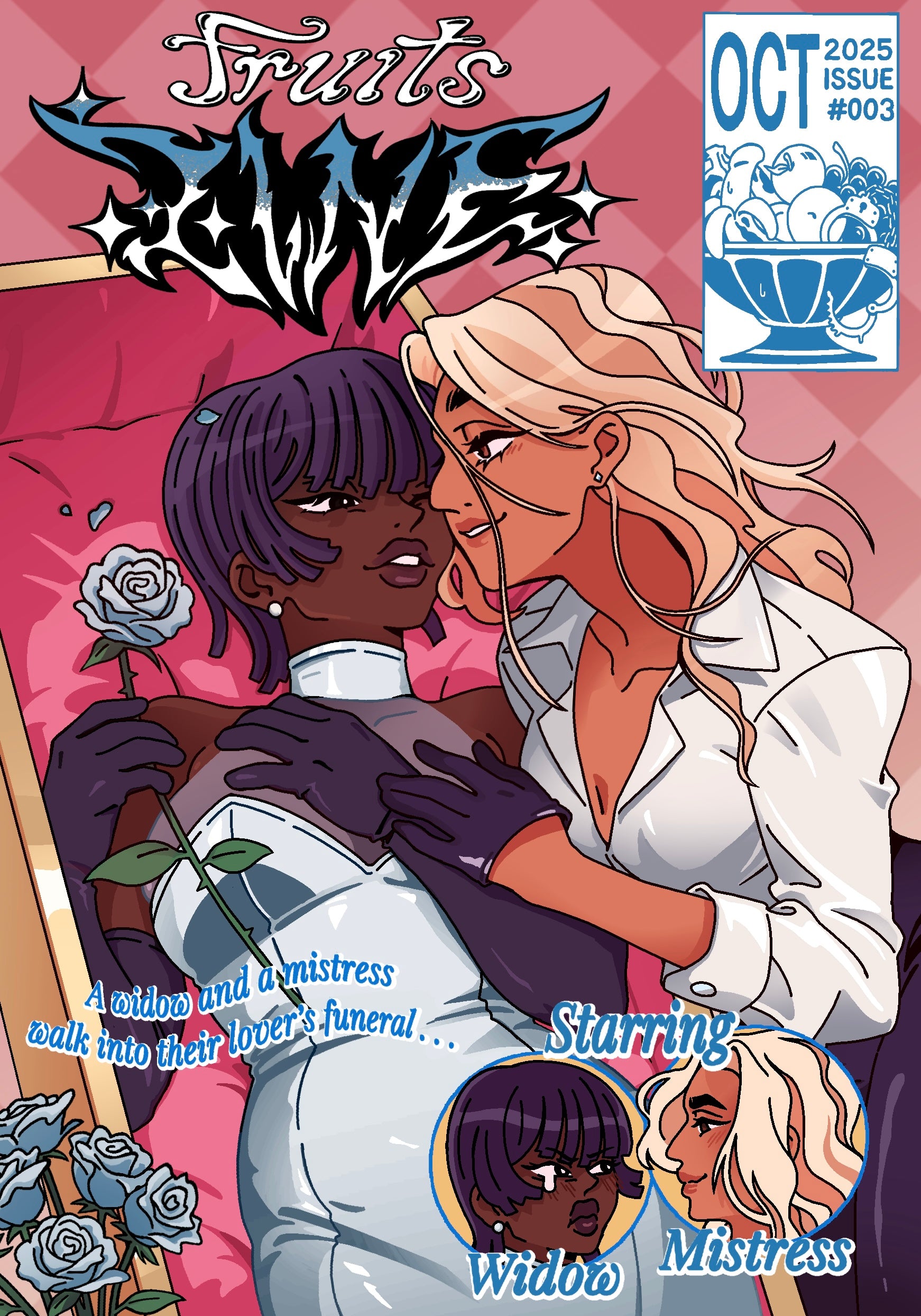 (Please read our content warning 🔞‼️) Fruits Zine #3 A Mistress and A Widow (18+ only) is a 12-page, mistress-meets-widow, sacrilegious erotica comedy, full-colour comic, available for digital PDF download.